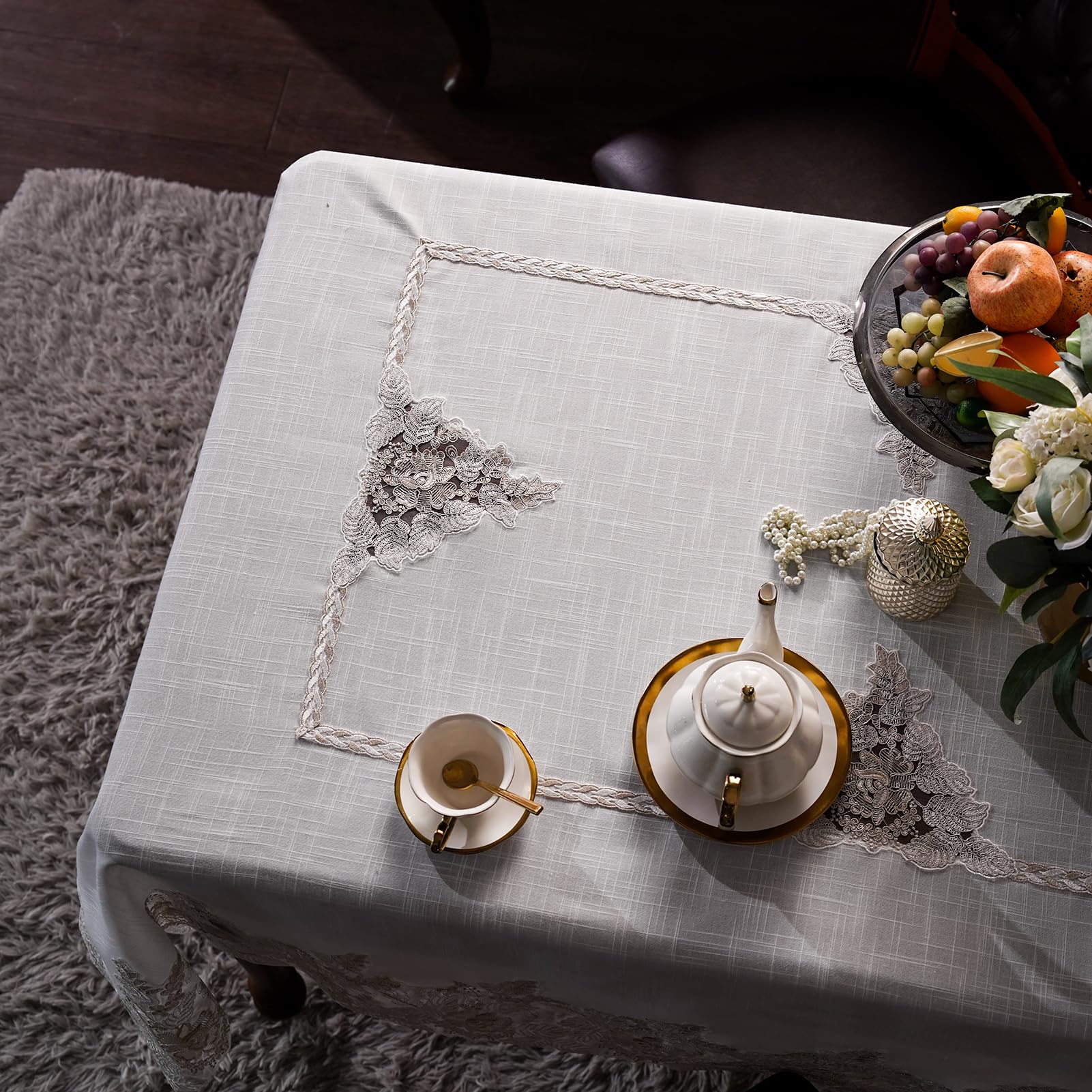 - MATERIAL: 100% treated polyester, the vintage tablecloth is made of heavy duty material with lace border, and makes it drape beautifully