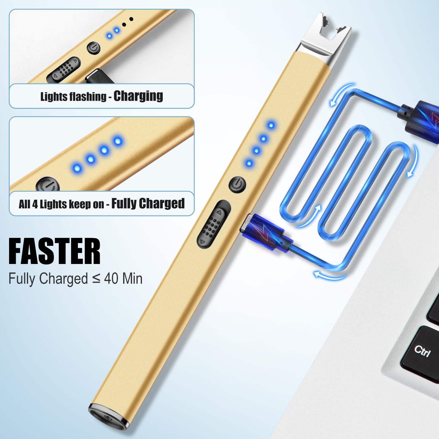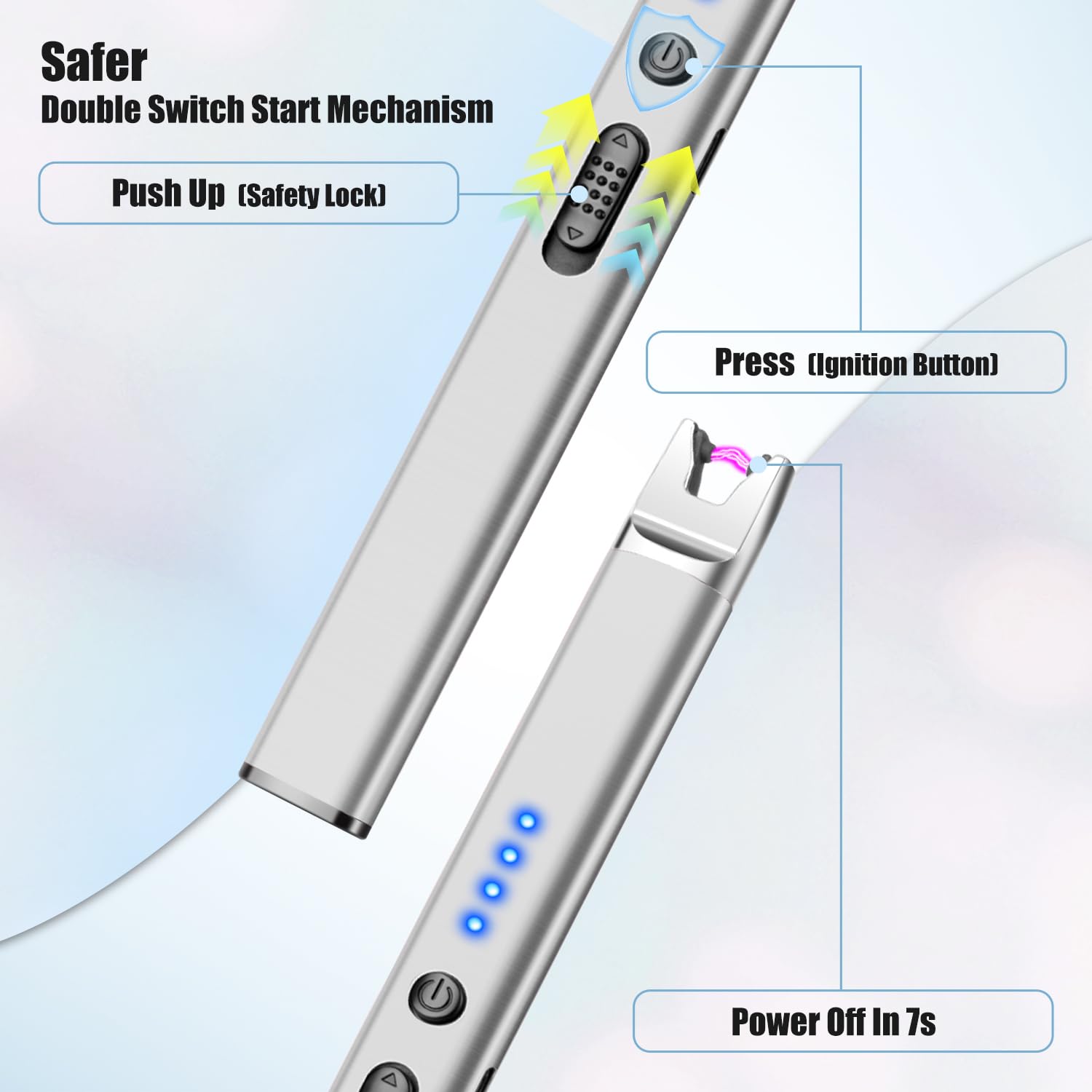 - Enhanced Safe and Efficient: This candle lighter not only upgraded auto power-off function after 7 seconds to ensure maximum safety, but also adds an external safety lock switch to prevent accidental ignition. Windproof arc lighters without gas or flame, let you safely light candles, grills, stoves and more