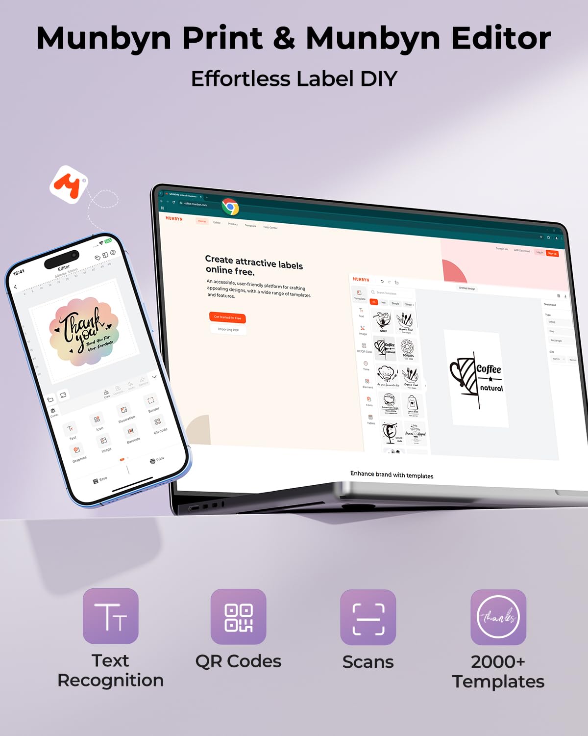- Customize labels for any occasion: With MUNBYN thermal label printer, access 3,500+ elements, 2,000+ templates, and 80+ fonts. Import PDFs/TXTs or use OCR for text recognition. Enjoy multi-language support across platforms. Download 'MUNBYN Print' for mobile and tablet, or visit the Google Chrome 'Munbyn editor' for laptop and desktop