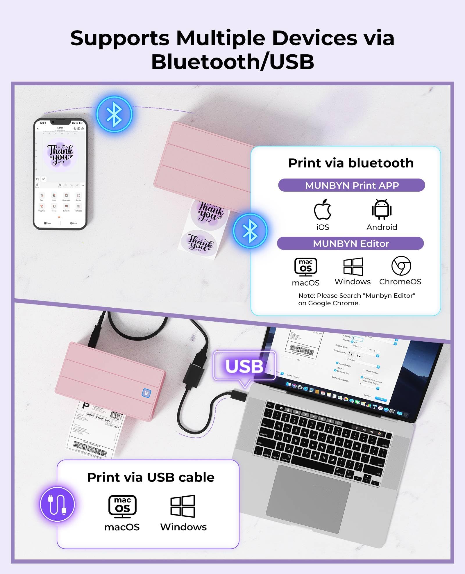 - Effortless Label Printing: Experience a simple 3-step setup—connect, design, and print. For iOS/Android, just download the 'MUNBYN Print' app to connect via Bluetooth. For PC, open Google Chrome and search the "Munbyn Editor" web, without any installation needed for Bluetooth wireless label design and printing. For Bluetooth-less desktops, connect via USB. Compatible with major online and shipping platforms, making your printing tasks effortlessly easy