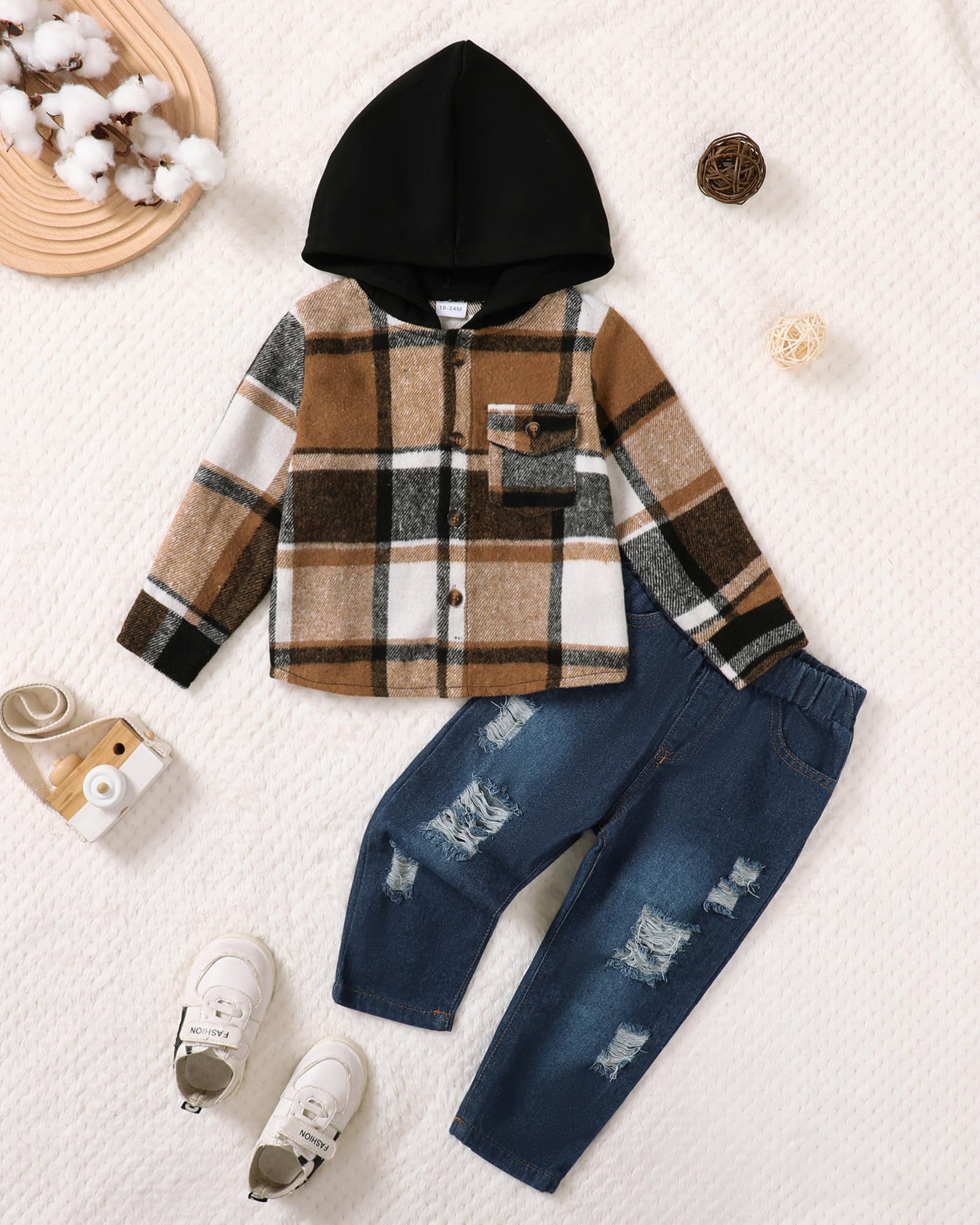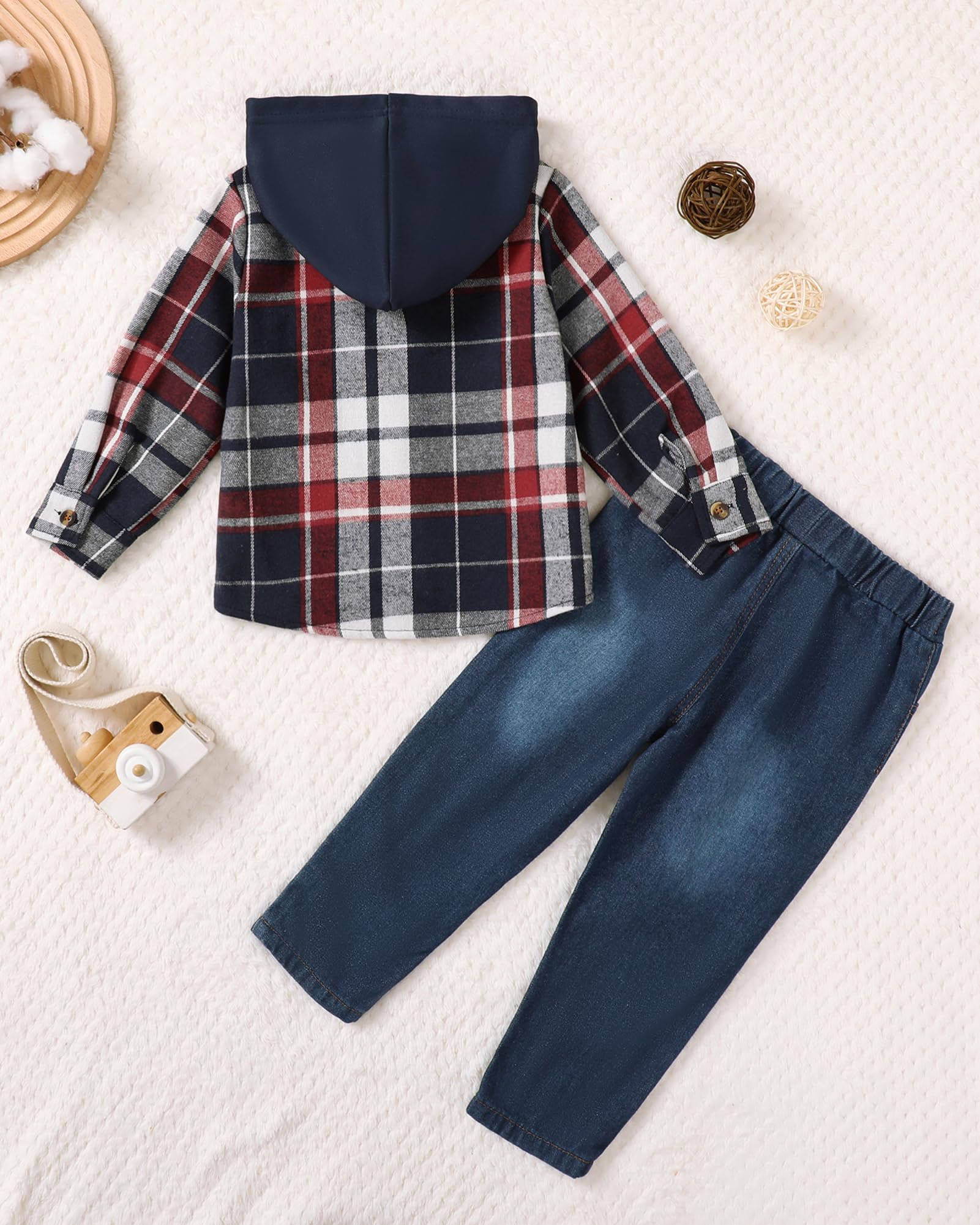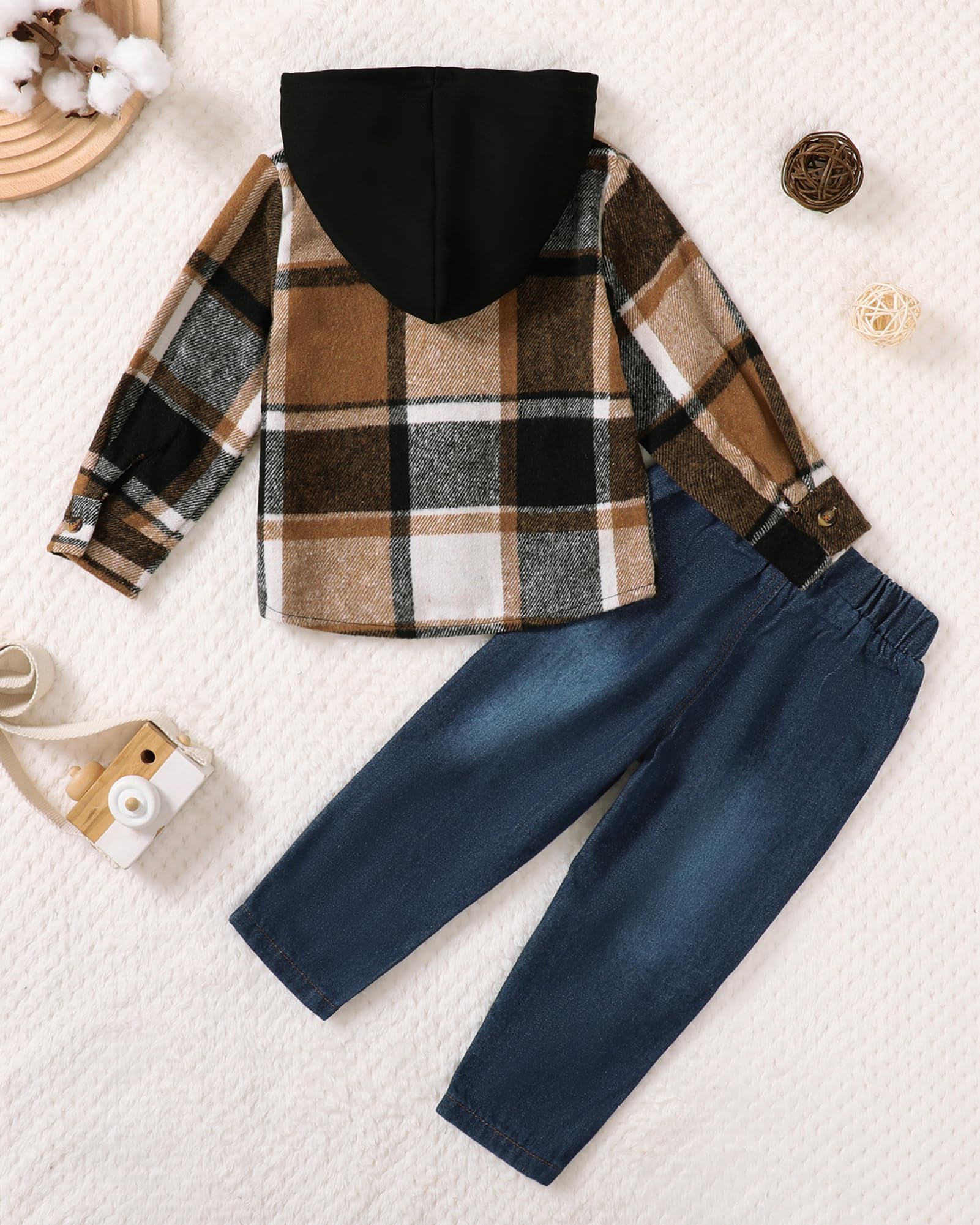 Toddler Baby Boys Clothes Flannel Shirts Set Plaid Hooded Tops +Jeans Pants