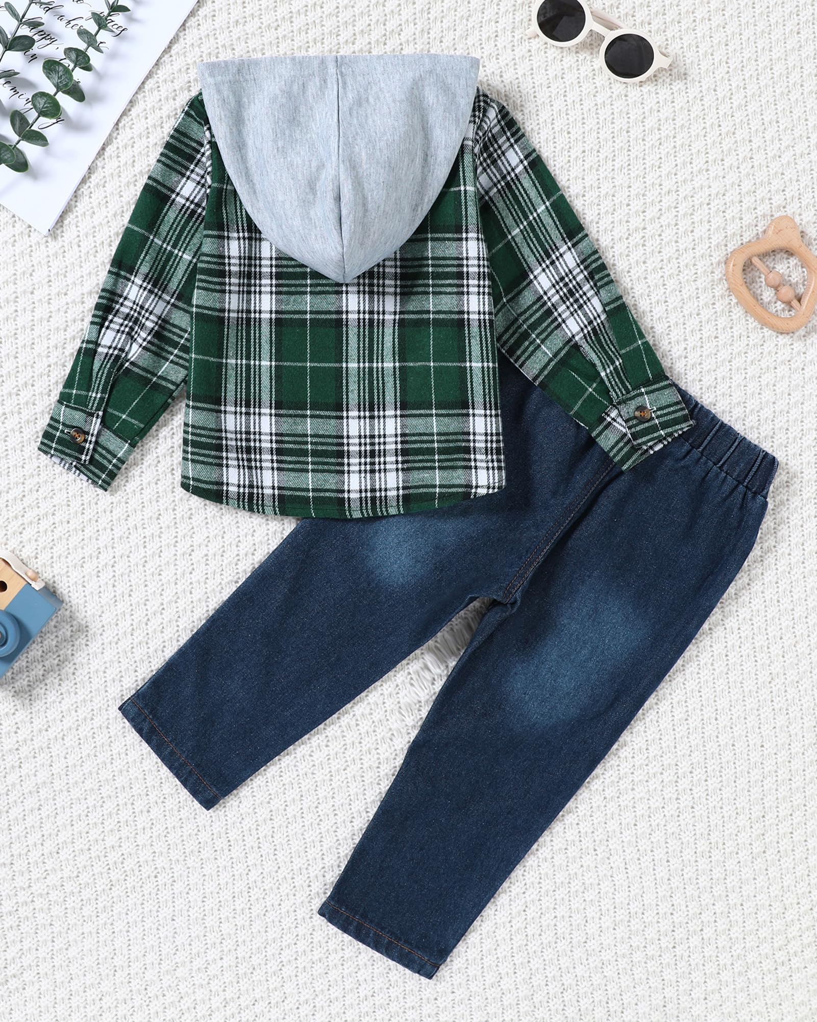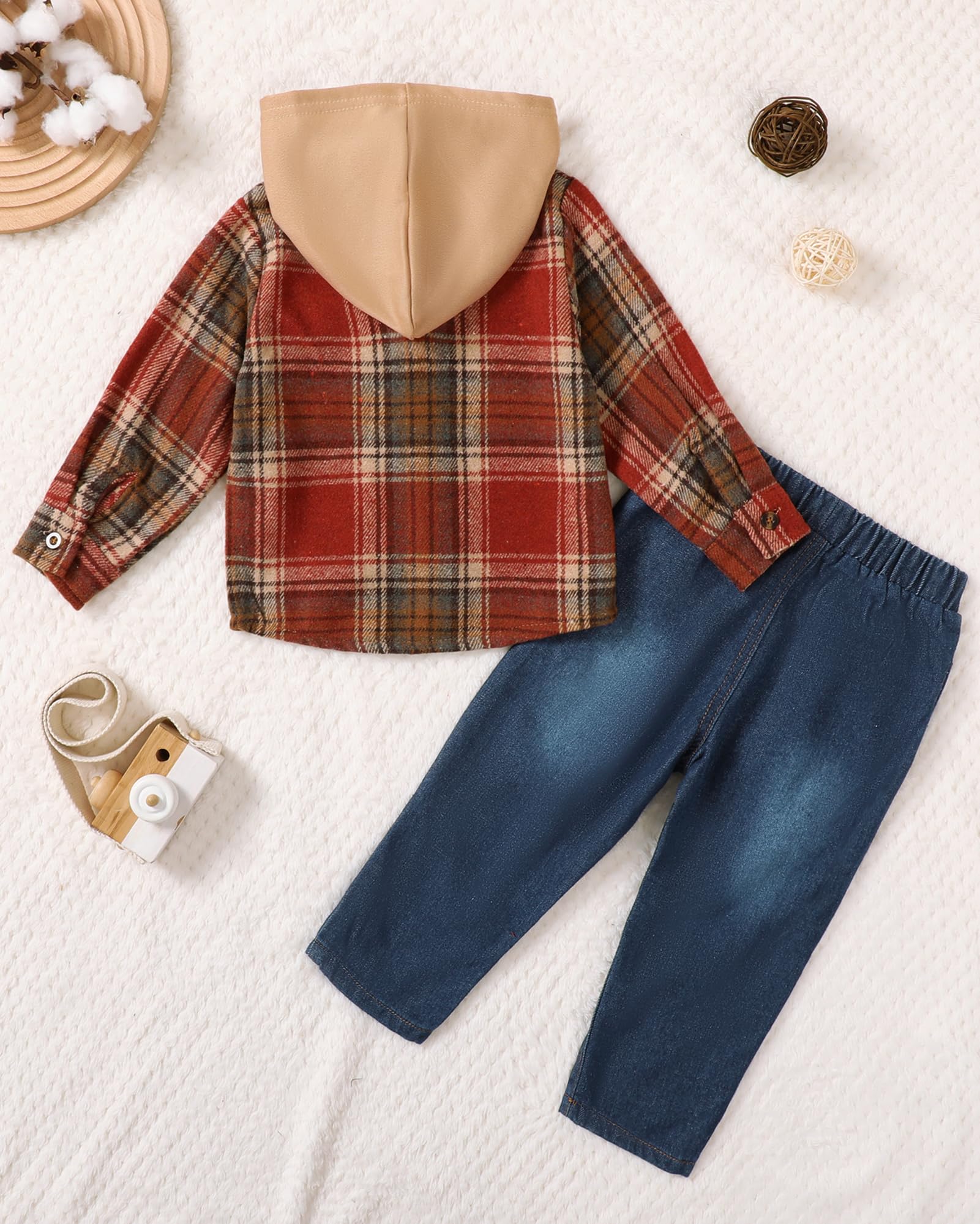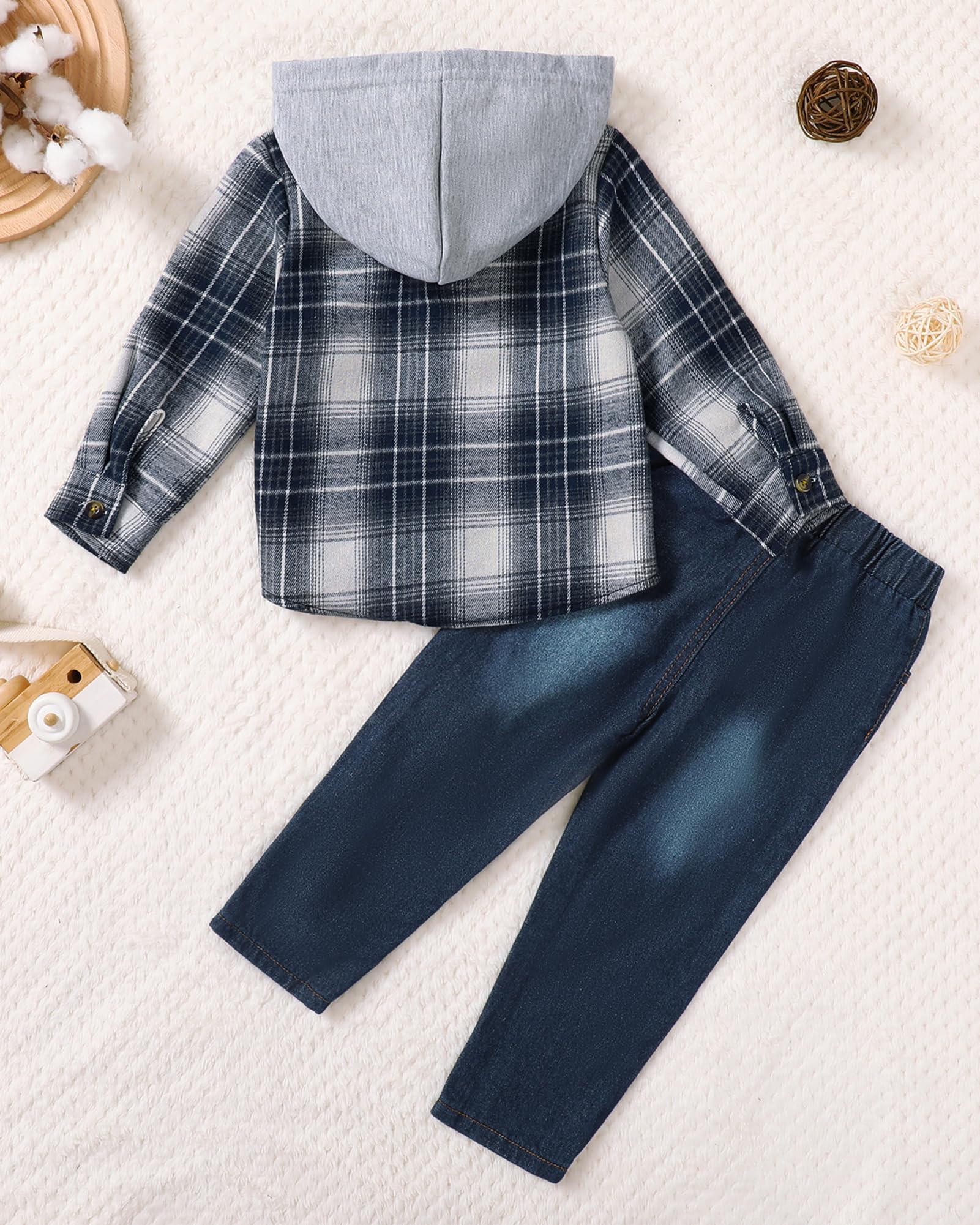 Toddler Baby Boys Clothes Flannel Shirts Set Plaid Hooded Tops +Jeans Pants