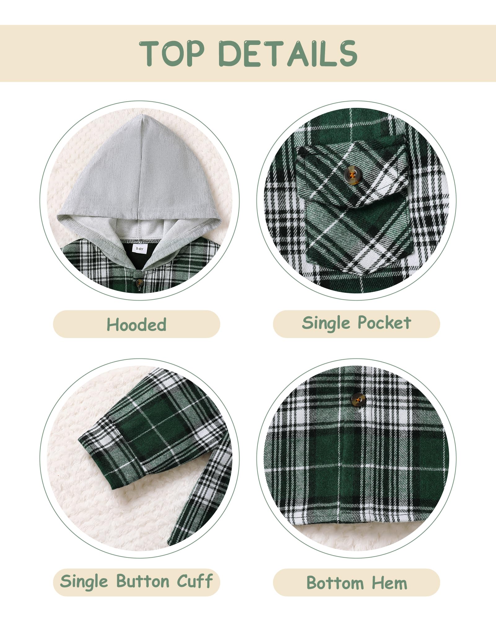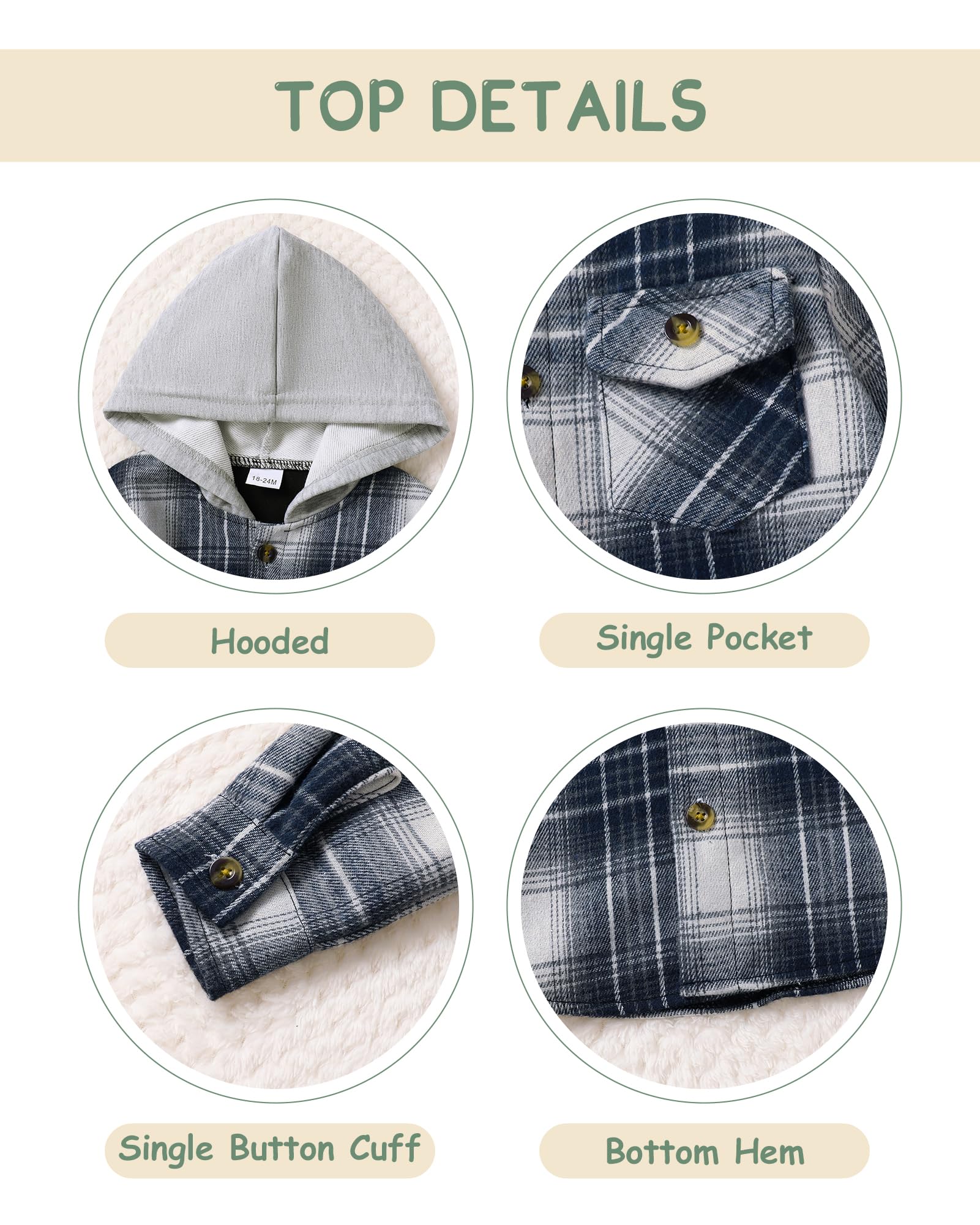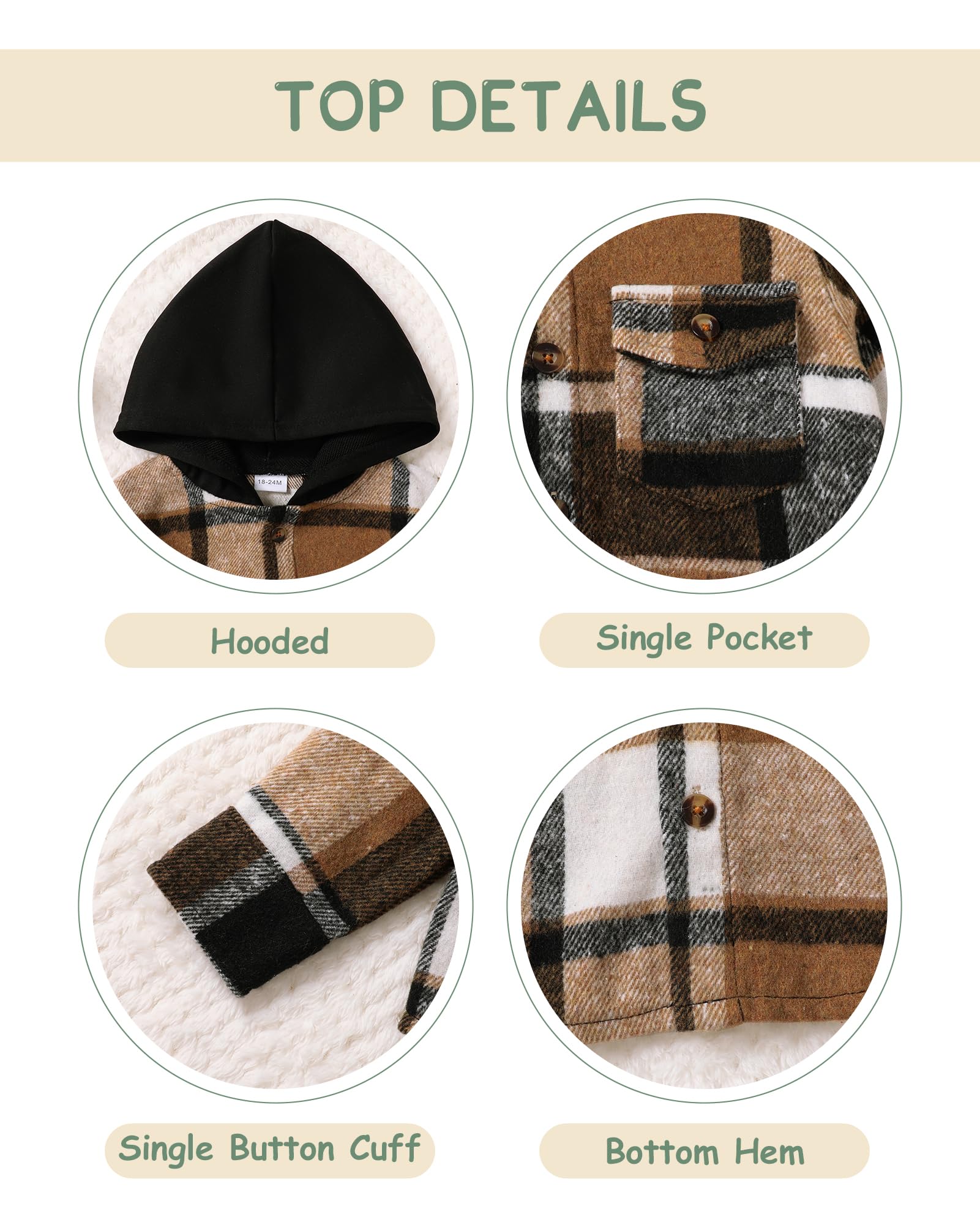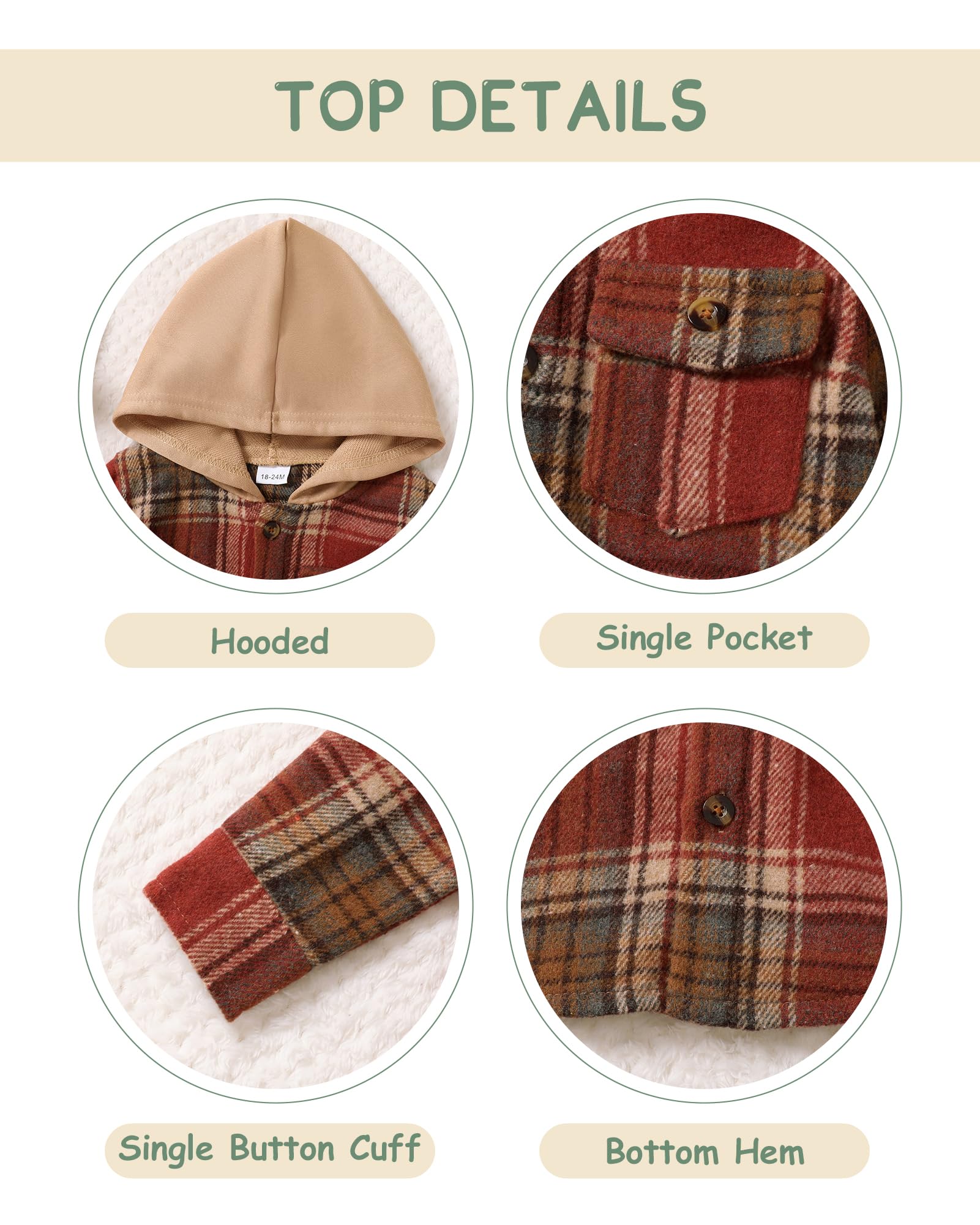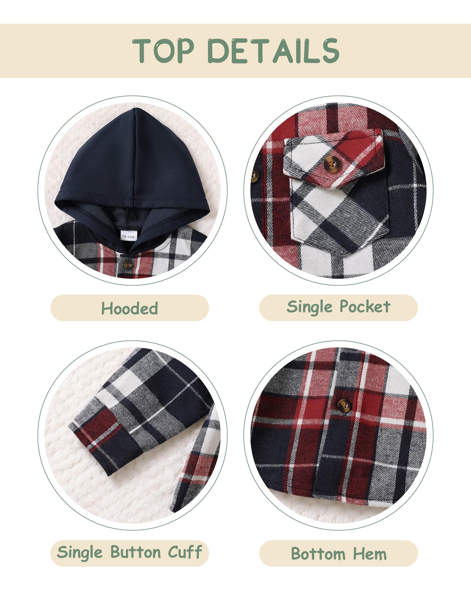 - Boys Flannel Shirts Set Size---This toddler boy hooded outfits is perfect for 18-24 months infant toddler boy, 2t 3t 4t 5t 6t little boy. Perfect fit for your growing toddler. Please check our size chart carefully before your order.